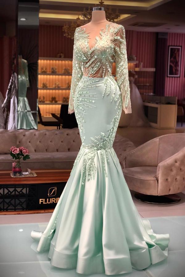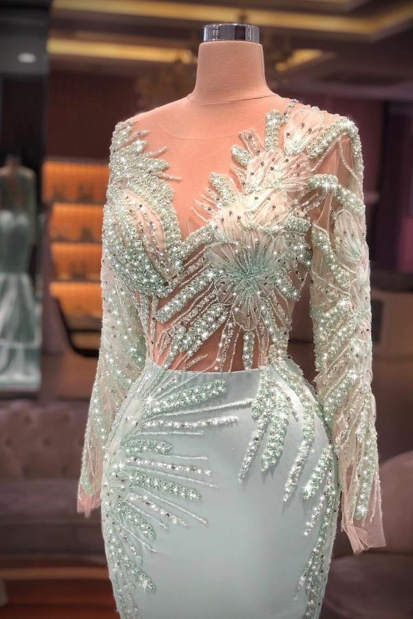 Robes de soirée menthe longues paillettes | Robes de bal avec manches en dentelle